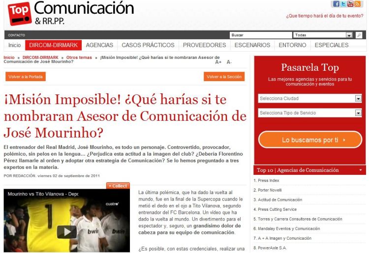 Madrid, 5 de setiembre del 2011.- Lola Raya, Directora del portal Top Comunicación & RRPP, envió unas preguntas sobre lo que haría si fuera el Asesor de Comunicación de José Mourinho, entrenador del equipo de fútbol del Real Madrid. Destaco aquí mis respuestas.
