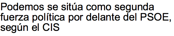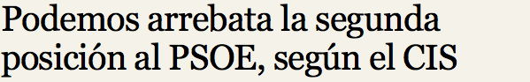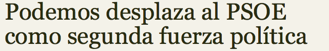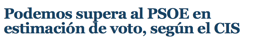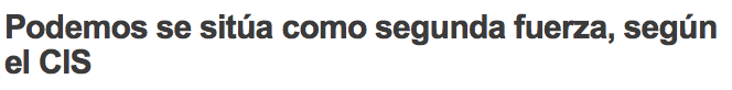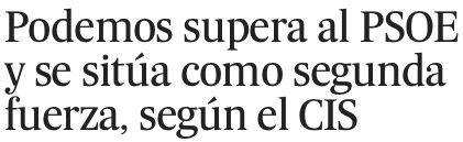 - Sólo un periódico detalla que Podemos es la segunda fuerza política en estimación de voto. (Un dato relevante porque en voto directo o en los resultados de la encuesta del CIS, sin correctores, el titular sería muy diferente).