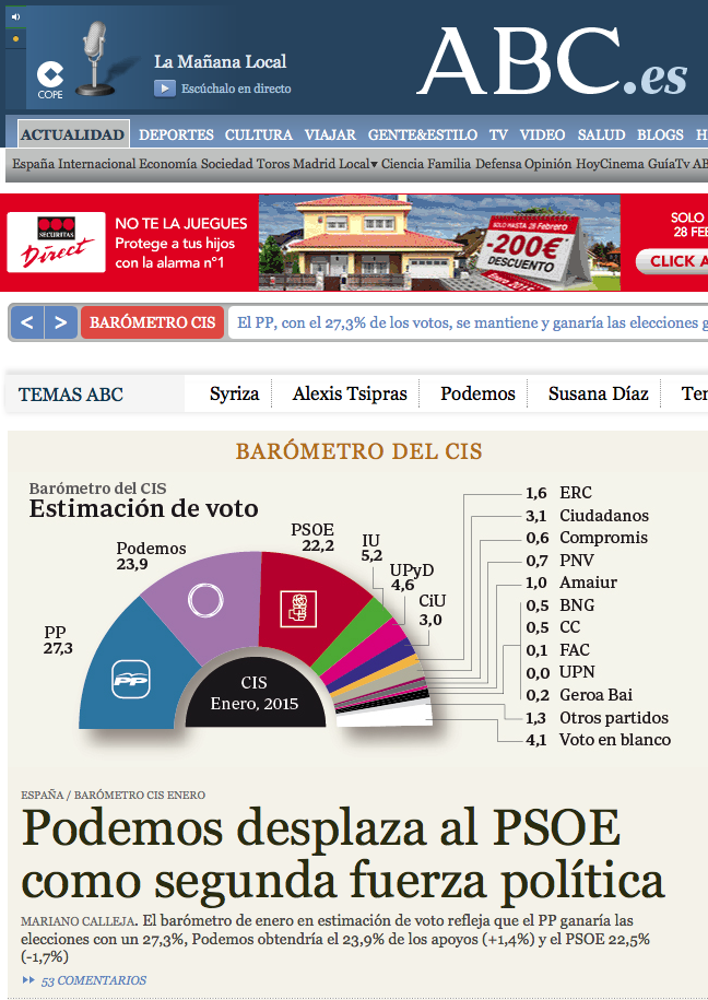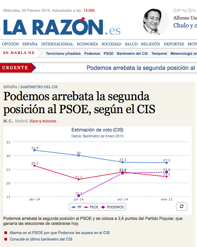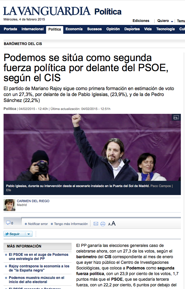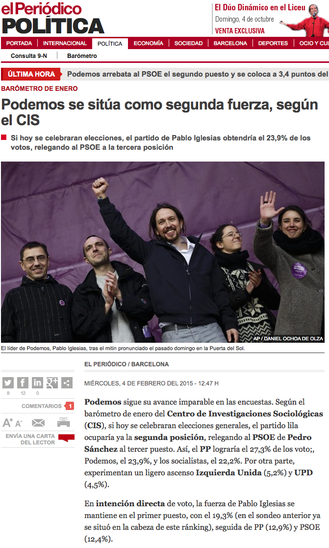 - Los 6 periódicos más importantes de España sentencian que Podemos, a día de hoy 4 de febrero del 2015, Podemos es la segunda fuerza política detrás del PP.