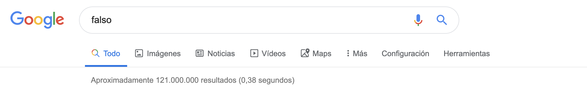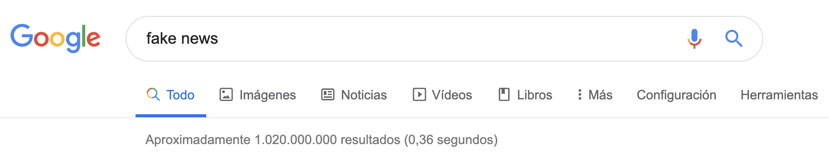 En el caso de «falso» aproximadamente 121 millones de entradas. Y con «fake news» aproximadamente 1.000 millones de entradas. Abres una red social y:
