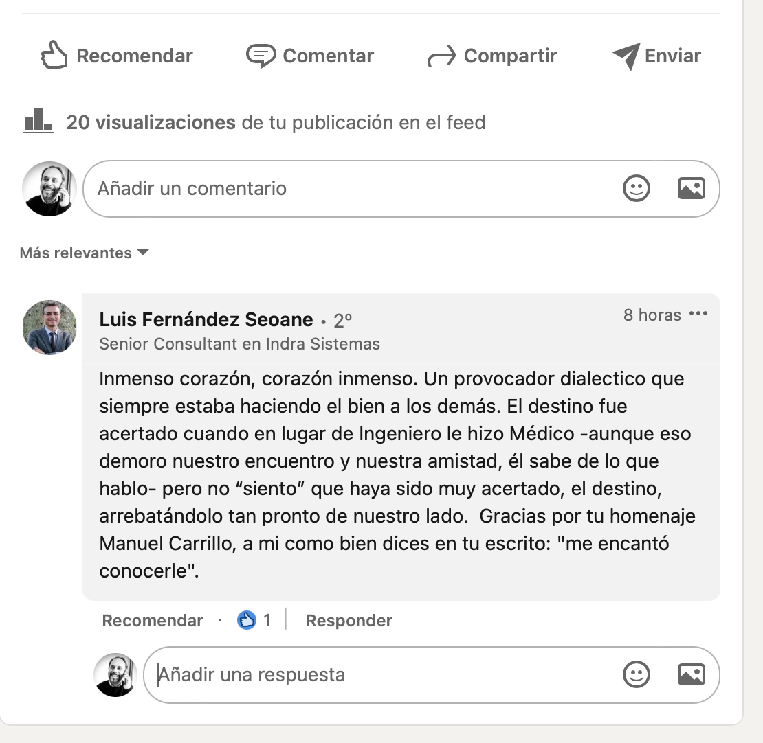 Tu carrera y tu ejemplo de profesión, doctor, merecen próximos reconocimientos por parte de tus colegas en los Colegios Médicos de Toledo y Madrid. Y por parte de tus pacientes en aquellos pueblos de Castilla y la Mancha. Seguro que no te gustará ver tu nombre en una Calle o en una Plaza, pero qué menos para honrarte. Seguro que no te gustará ver tu nombre en una Cátedra sobre los efectos positivos de la acupuntura, pero qué menos para honrarte.