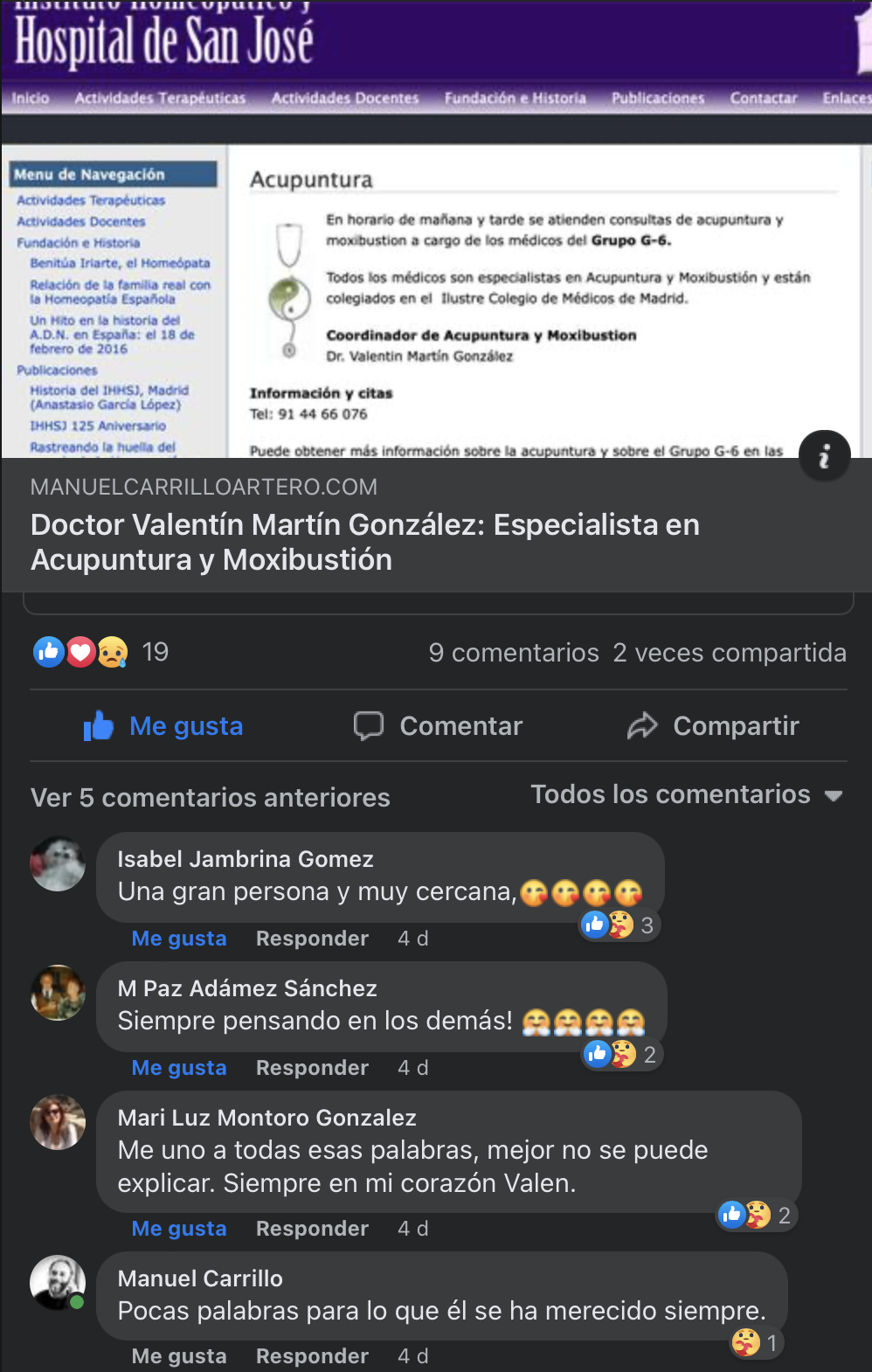 El Doctor Valentín Martín González siempre atendió a cualquier ser humano con una dolencia, por teléfono, email, mensajes, videollamadas, y por su puesto, en las consultas de pueblos y grandes ciudades. A cualquier hora, repito a cualquier hora, de lunes a viernes, festivos y vacaciones. Siempre con la seriedad del profesional, siempre con la sonrisa de la persona cercana, amable, acogedora.